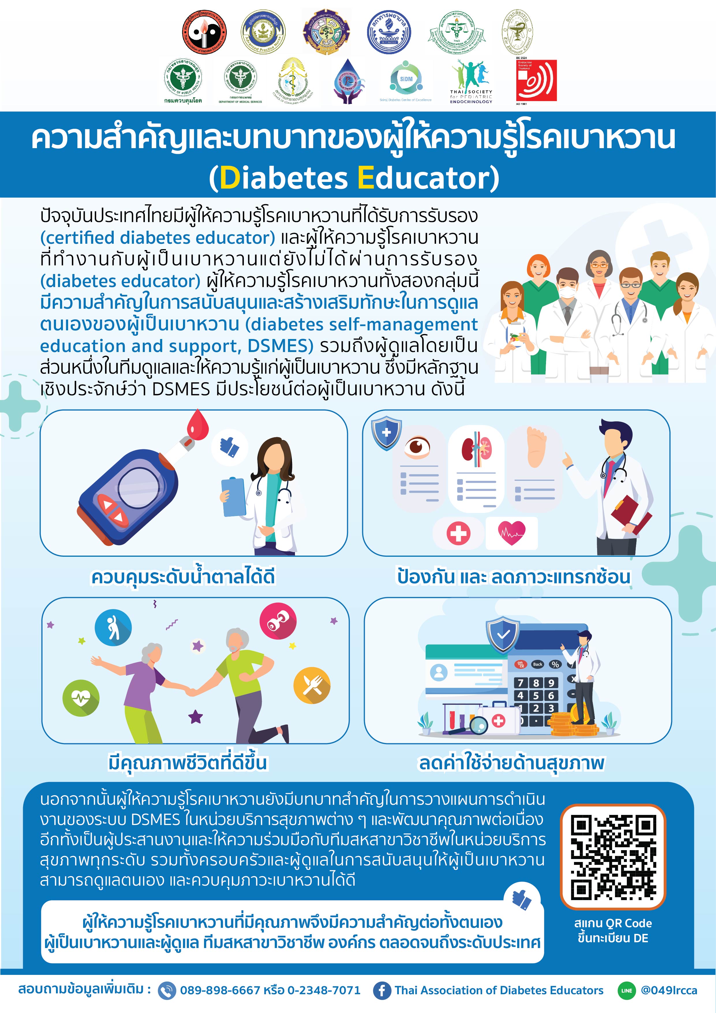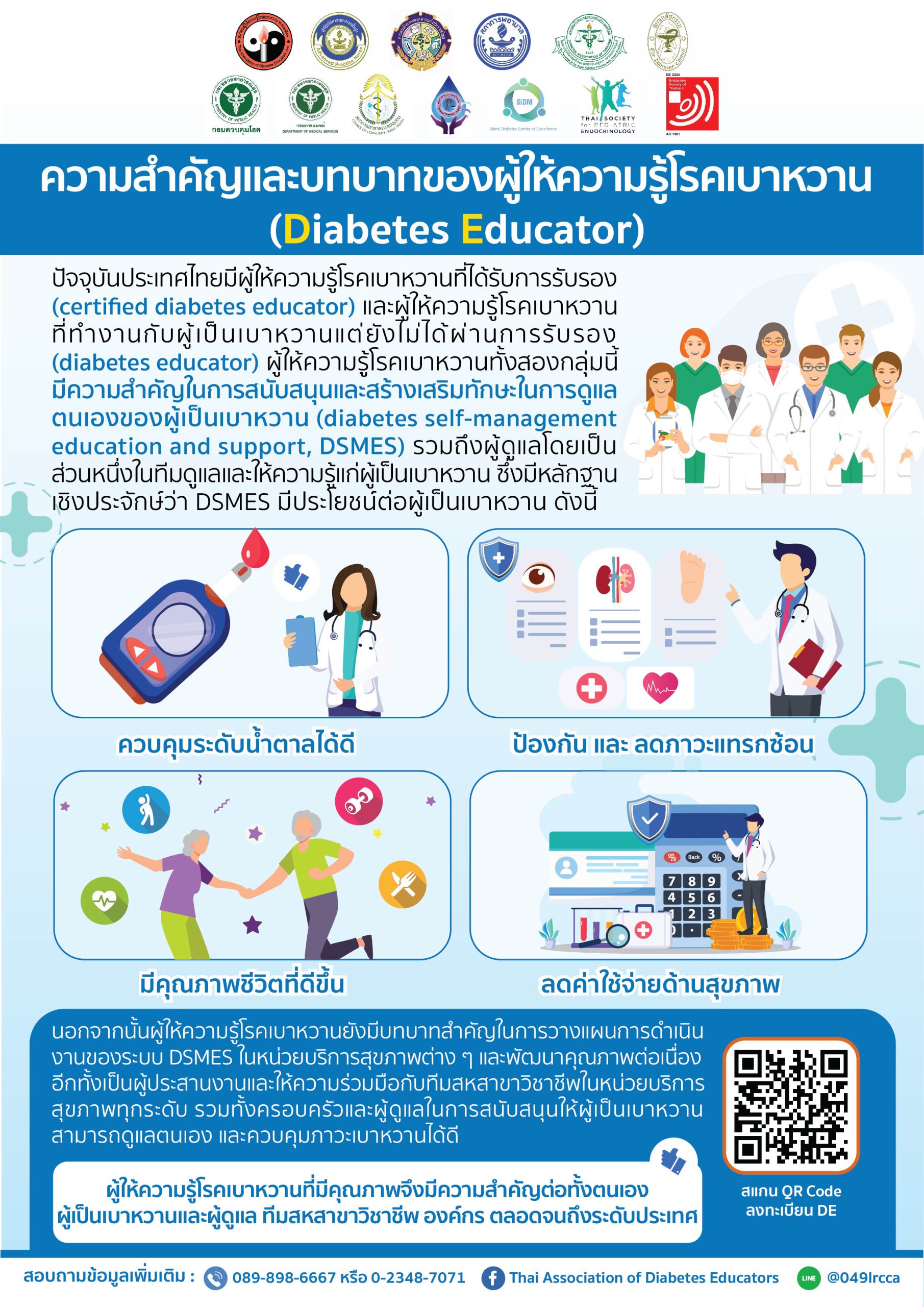 คำชี้แจงการขึ้นทะเบียนคำชี้แจง การขึ้นทะเบียนผู้ให้ความรู้โรคเบาหวาน (Diabetes Educator) สมาคมโรคเบาหวานแห่งประเทศไทย ในพระบรมราชูปถัมภ์ฯ โดยความร่วมมือขององค์กรวิชาชีพต่าง ๆ ได้จัดทำแนวทางการพัฒนาเพื่อมาตรฐานคลินิกเบาหวานของประเทศไทยเมื่อปี พ.ศ.2562 และปรับปรุงเมื่อปี พ.ศ. 2567 ได้แบ่งคลินิกเบาหวานเป็นสามระดับและได้แนะนำให้มีบุคลากรที่ทำหน้าที่ให้ความรู้โรคเบาหวานในทุกระดับของคลินิก ดังนี้ คลินิกเบาหวาน ควรมีผู้ให้ความรู้โรคเบาหวาน (Diabetes Educator) ศูนย์เบาหวาน ควรมีผู้ให้ความรู้โรคเบาหวานที่ผ่านการรับรอง (Certified Diabetes Educator) ศูนย์ความเป็นเลิศโรคเบาหวาน ควรมีผู้ให้ความรู้โรคเบาหวานที่ผ่านการรับรอง (Certified Diabetes Educator) เพื่อให้สอดคล้องกับแนวทางการพัฒนาเพื่อมาตรฐานคลินิกเบาหวาน คณะทำงานมาตรฐานผู้ให้ความรู้โรคเบาหวาน ซึ่งแต่งตั้งโดยกรมควบคุมโรค ได้จัดให้มีการขึ้นทะเบียนผู้ให้ความรู้โรคเบาหวาน Diabetes Educator โดยคณะกรรมการผู้ทรงคุณวุฒิ จากสมาคมผู้ให้ความรู้โรคเบาหวาน สมาคมโรคเบาหวานแห่งประเทศไทย ในพระบรมราชูปถัมภ์ฯ และสมาคมนักกำหนดอาหารแห่งประเทศไทย เป็นผู้ตรวจสอบคุณสมบัติ และรับรอง ประโยชน์ของการขึ้นทะเบียนผู้ให้ความรู้โรคเบาหวาน ได้ประเมินสมรรถนะในการเป็นผู้ให้ความรู้โรคเบาหวานของตนเองอย่างครบถ้วน ได้เข้าใจสมรรถนะของผู้ให้ความรู้โรคเบาหวาน ซึ่งจะช่วยในการเตรียมตัวเพื่อเป็นผู้ให้ความรู้โรคเบาหวานที่ได้รับการรับรองในอนาคต มีช่องทางในการติดต่อกับสมาคมวิชาชีพและรับข่าวสารเกี่ยวกับการประชุมวิชาการและการอบรม เพื่อเพิ่มความรู้และทักษะในการดูแลผู้เป็นเบาหวาน ขั้นตอนการขึ้นทะเบียนผู้ให้ความรู้โรคเบาหวาน และเอกสารที่ต้องเตรียม ตรวจคุณสมบัติ ประสบการณ์การทำงาน ด้านการดูแลผู้เป็นเบาหวานของตนเองว่าเข้าเกณฑ์ที่กำหนดหรือไม่ (รายละเอียดด้านล่าง) ด้านการเพิ่มพูนความรู้ ให้เรียงลำดับการอบรมที่เข้าร่วมในระยะสองปีที่ผ่านมา และพิจารณาประเมินว่า เนื้อหาการอบรมแต่ละครั้งนั้น สอดคล้องกับหัวข้อสมรรถนะ (competency) ด้านใดบ้าง (ดูข้อมูลเพิ่มเติม : คลิกที่นี่) อัพโหลดเอกสารการสมัคร และแนบหลักฐานการอบรม 3.1 สำเนาใบปริญญาบัตร 3.2. สำเนาใบประกอบวิชาชีพ 3.3 หนังสือรับรองจากต้นสังกัดหรือผู้บังคับบัญชาที่รับรองประสบการณ์ทำงานในสาขาที่ผู้สมัครจบการศึกษา และรับรองประสบการณ์ทำงานเกี่ยวกับการดูแลให้ความรู้ผู้เป็นเบาหวานตามเกณฑ์ข้างต้น 3.4 ใบรับรองการผ่านการอบรมด้านเบาหวาน พร้อมตารางการอบรมนั้น ๆ 3.5 กรอกฟอร์มการประเมินการอบรมเฉพาะ