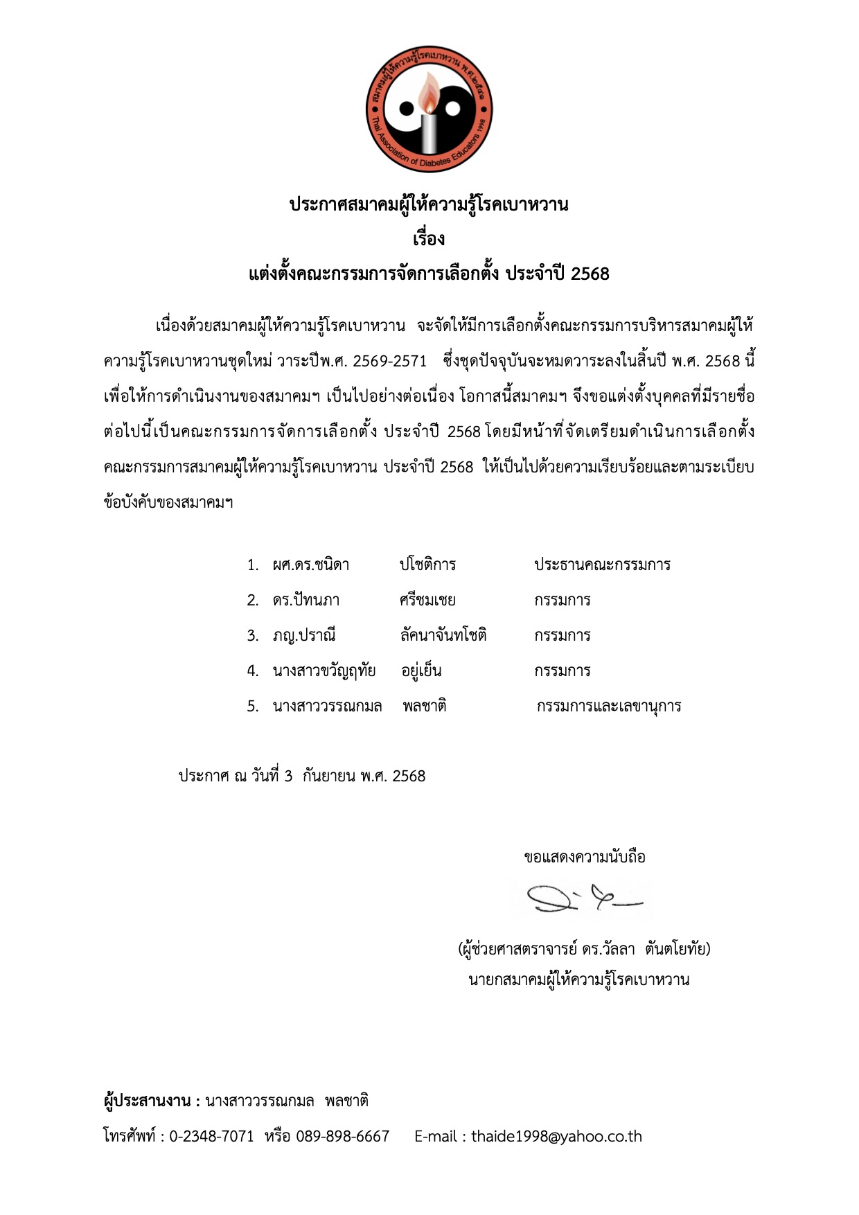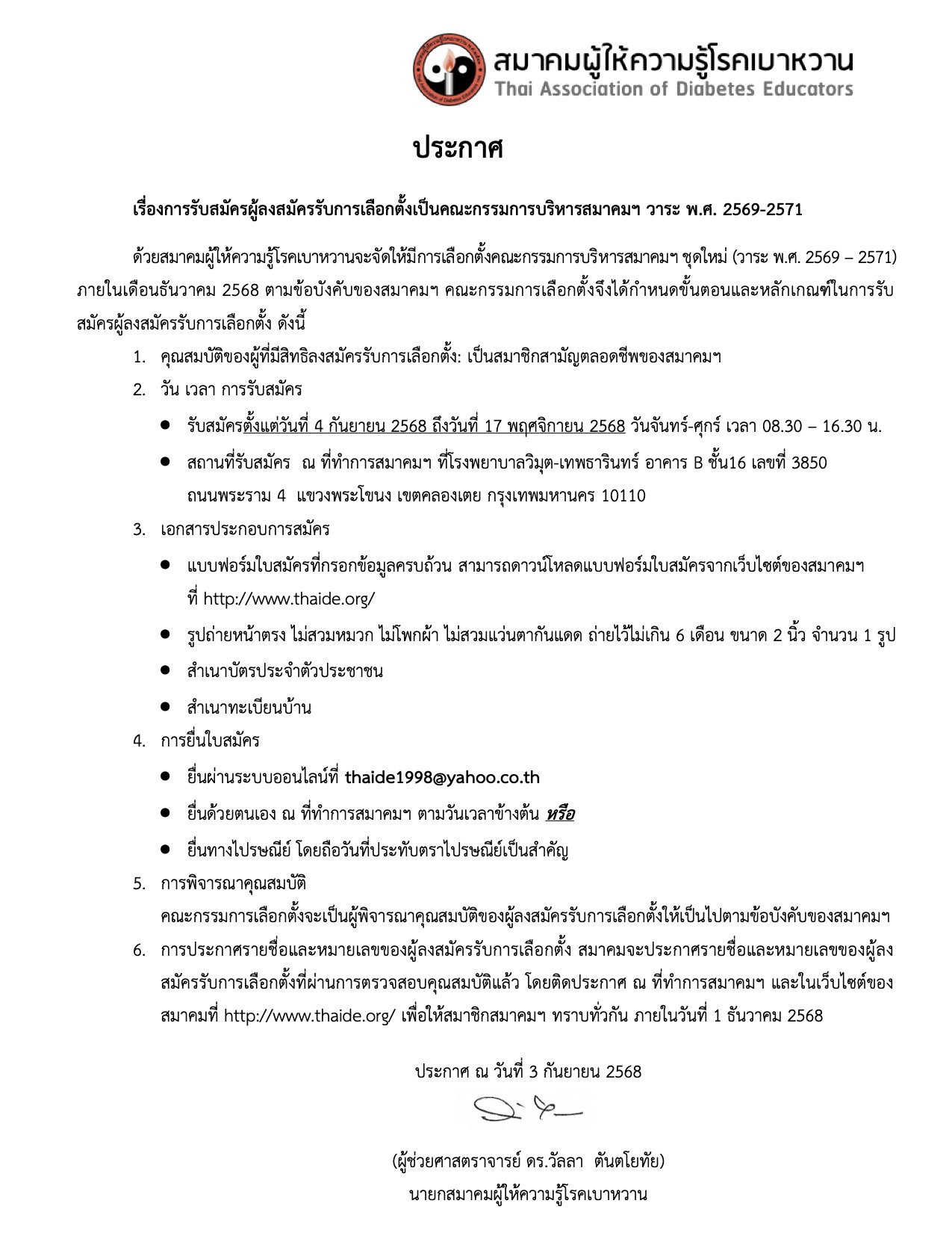 ใบสมัครรับเลือกตั้งกรรมการสมาคมผู้ให้ความรู้โรคเบาหวาน วาระ พ.ศ. ๒๕๖๙ – ๒๕๗๑
